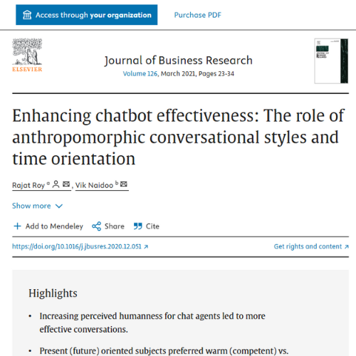 Author links open overlay Increasing perceived humanness for chat agents led to more effective conversations. Present (future) oriented subjects preferred warm (competent) vs. competent (warm) chatbot conversations. Matching time orientation with conversation type led to favourable attitudes and purchase intentions. Brand perceptions further mediated the above effects.