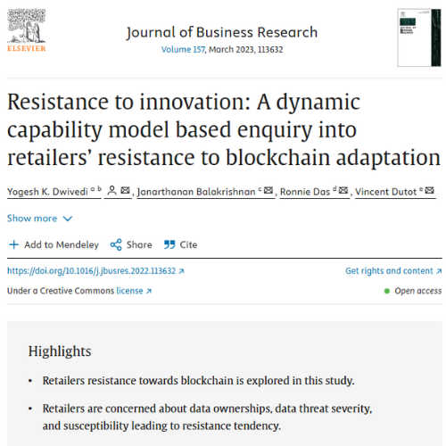 A dynamic capability model based enquiry into retailers’ resistance to blockchain adaptation. Received 14 October 2022, Revised 26 December 2022, Accepted 29 December 2022, Available online 4 January 2023, Version of Record 4 January 2023.